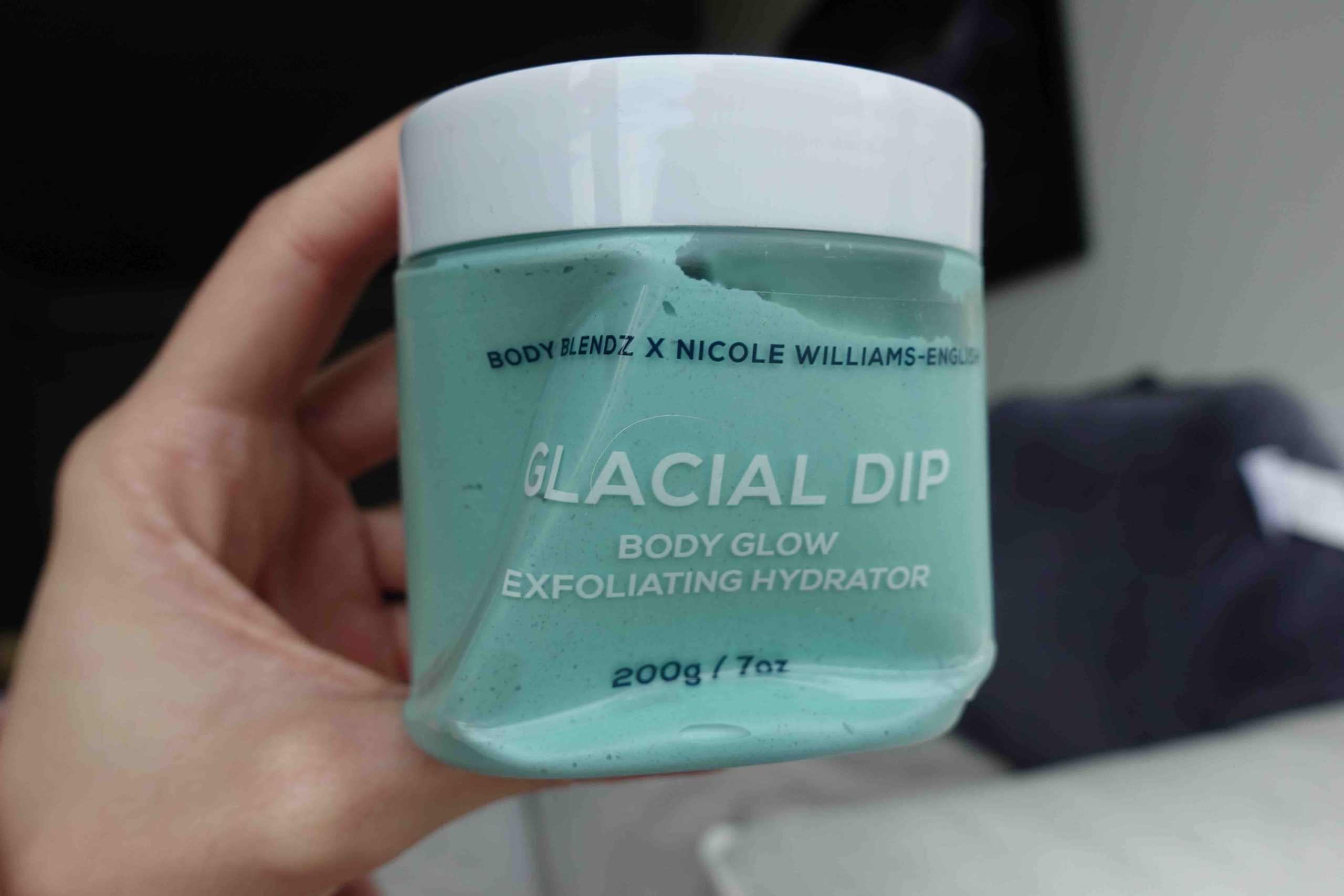 Quick disclaimer: The Glacial Dip Body Glow Exfoliating Hydrator got a little beat up on the ride over, which is why it looks funky. Don’t judge a book by its cover! Or rather, a product by its container??