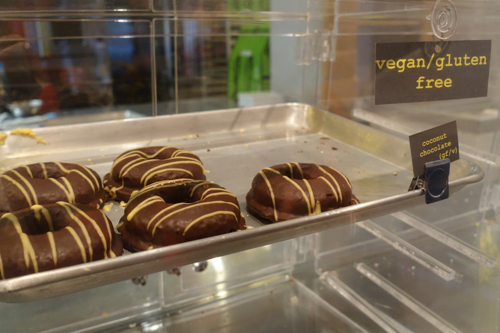 FONUTS. No, not “fucking donuts” but rather “faux donuts”. On the website, they are described to be “donuts that are baked/steamed, never fried”. Well, we got there kind of late so most of the vegan donuts ran out, but there was one flavor left: Chocolate Coconut! It was delicious and super soft and moist. I apologize to all the people…