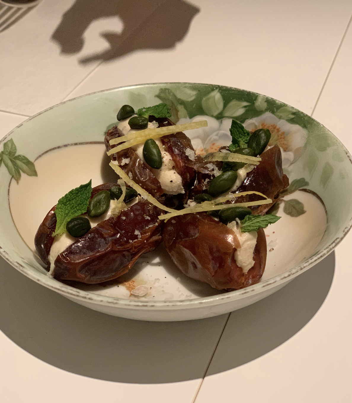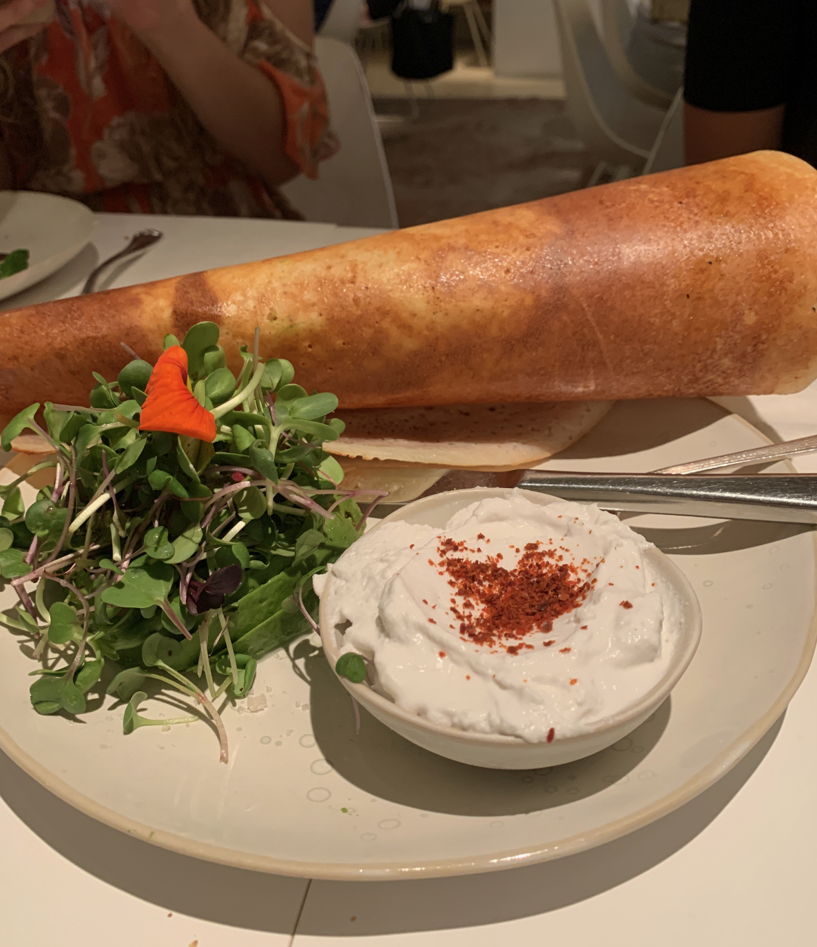 We got the pain au chocolat, the dosa, the corncakes, stuffed dates, and an iced matcha latte. This is one of those places where you get a bunch of stuff to split with the table, which isn’t my favorite concept because I never feel full after or I feel TOO full. Also the foods have all these different types of flavors because they are trying to be fancy, but like sometimes… simpler is better?