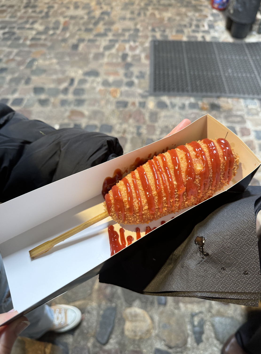We were going down some of the market alleyways (which have additional food stalls) and stumbled across a Korean corn dog stand (forget the name) that had a vegan option with a vegan sausage in it. Both my sister and I agreed it was just ok, but it’s the vegan thought that counts!