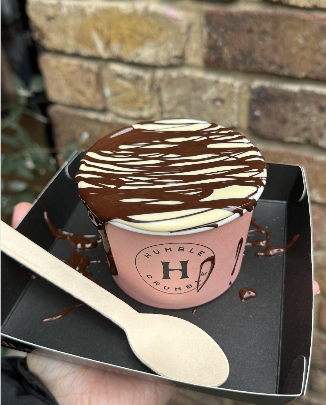 We got one apple crumble with custard on top and one pure crumble (no fruit) with custard and chocolate sauce on top. They were AMAZING. Both were so freaking incredible. Also, it’s kind of insane how this apple crumble was one of the best I’ve ever had and it wasn’t even in America… people say London has shitty food, but the vegan food is lowkey FIRE.