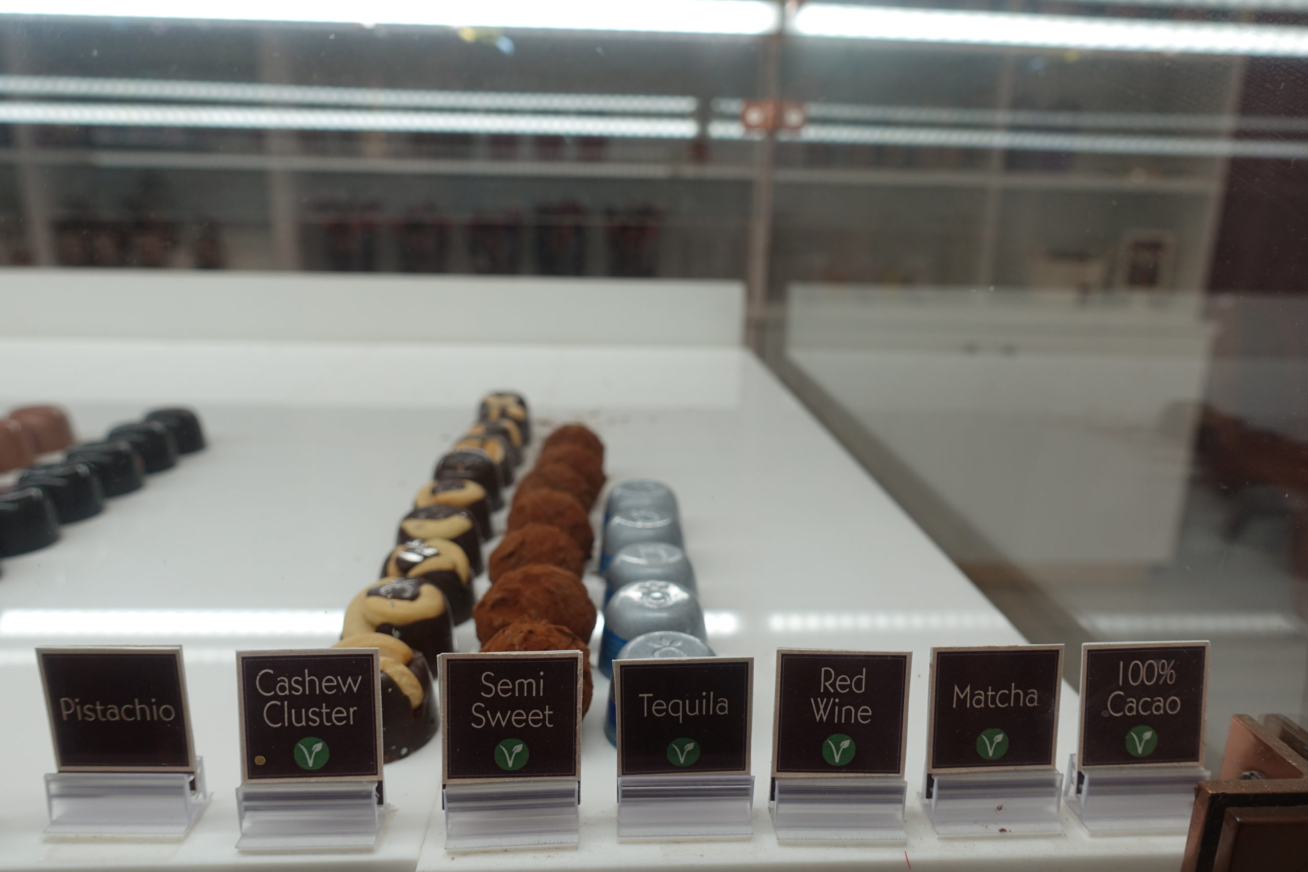The whole chocolate shop isn’t vegan though, but they did have a few packaged items on the shelves that were vegan, which the cashier very kindly pointed out to us. They also had vegan dark chocolate-covered strawberries, vegan chocolate bonbons, and blended drinks with non-dairy milk.