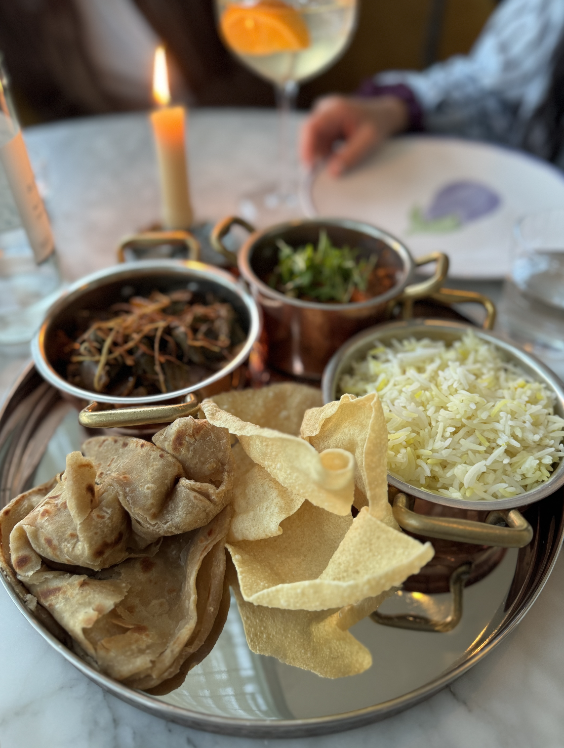 To start, we got some chutneys and dipping sauces, a beetroot falafel fritter of sorts, and a puffed rice and chickpea salad. Then, for the main course, we got some chips for dippings, roti (so flakey and delicious), Indian rice, chickpea curry, and a warm mushroom dish. It was honestly pretty delicious and filling! Not the BEST Indian food I’ve ever had, but I was blown away by the countless vegan options and accommodations!
