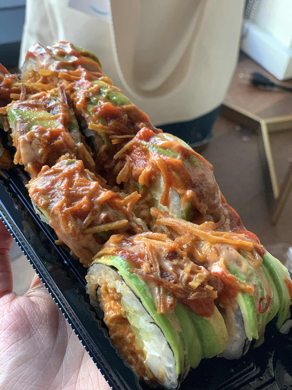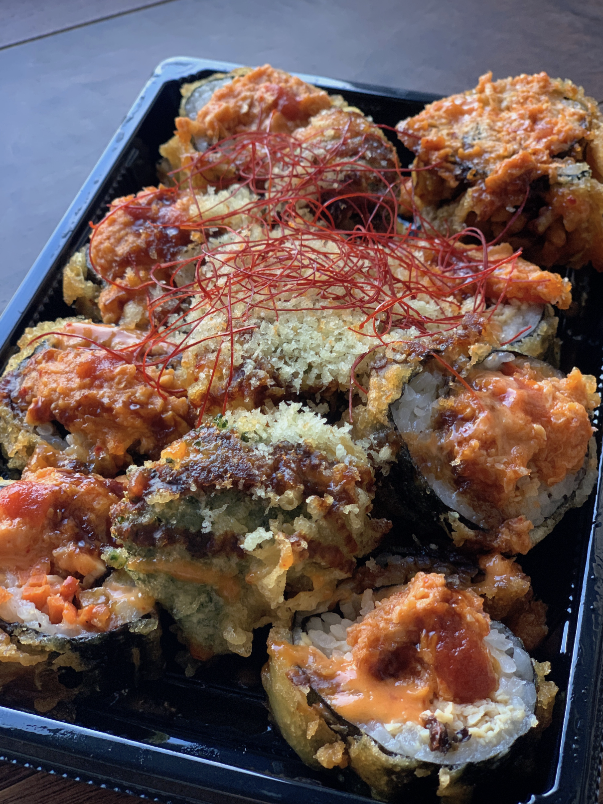 I also got the ‘volcano roll’ which was a vegan california roll with spicy tuna, covered in tempura with a vegan sauce. That one was also SO delicious, super hefty, and really filling. I ate two bites and was stuffed. I feel like it was enough sushi for like four people. So yummy though!!!