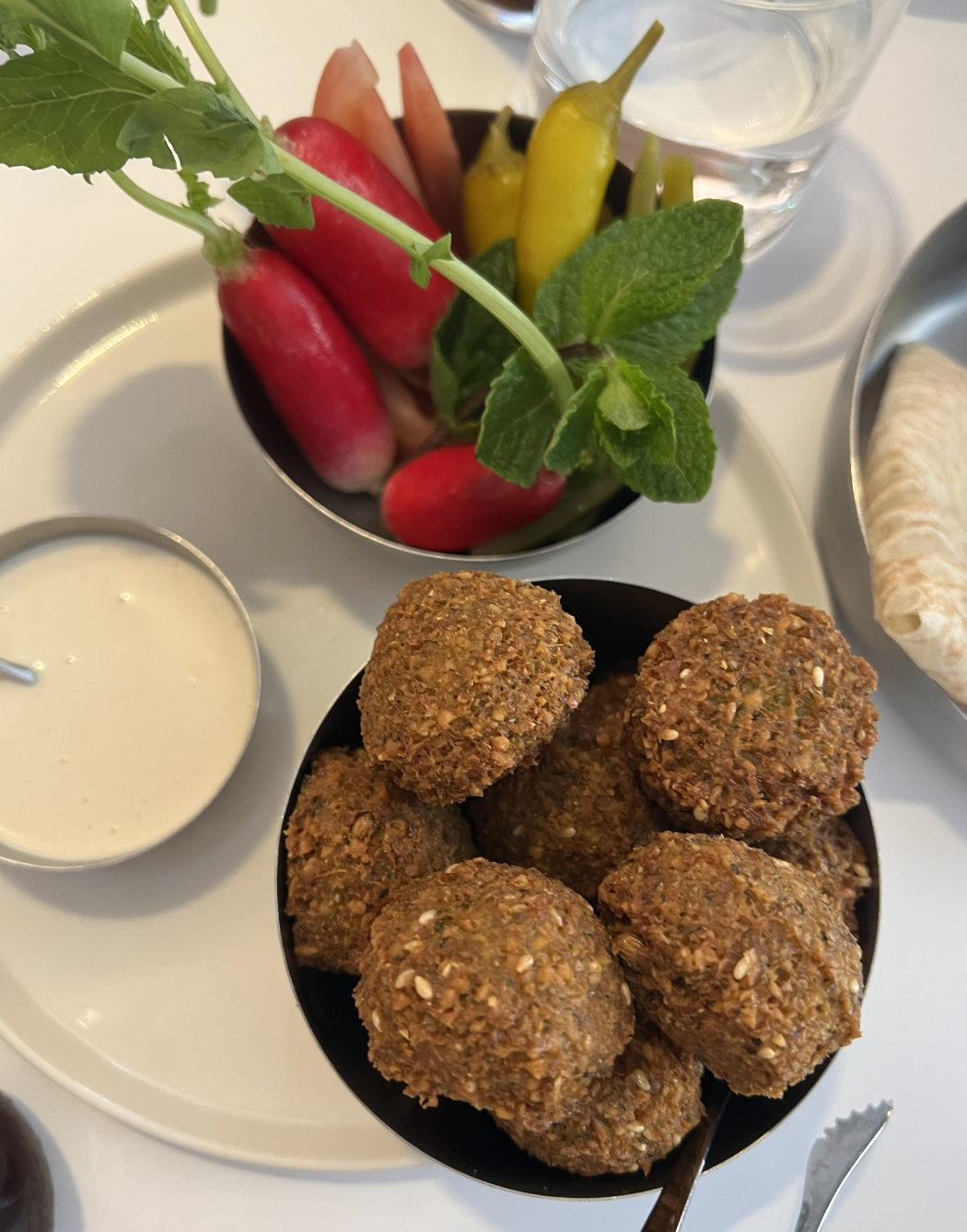 My sister, friends, and I all ended up splitting a few fattoush salads, falafel with tahini, and heaps of fresh hummus and pita.