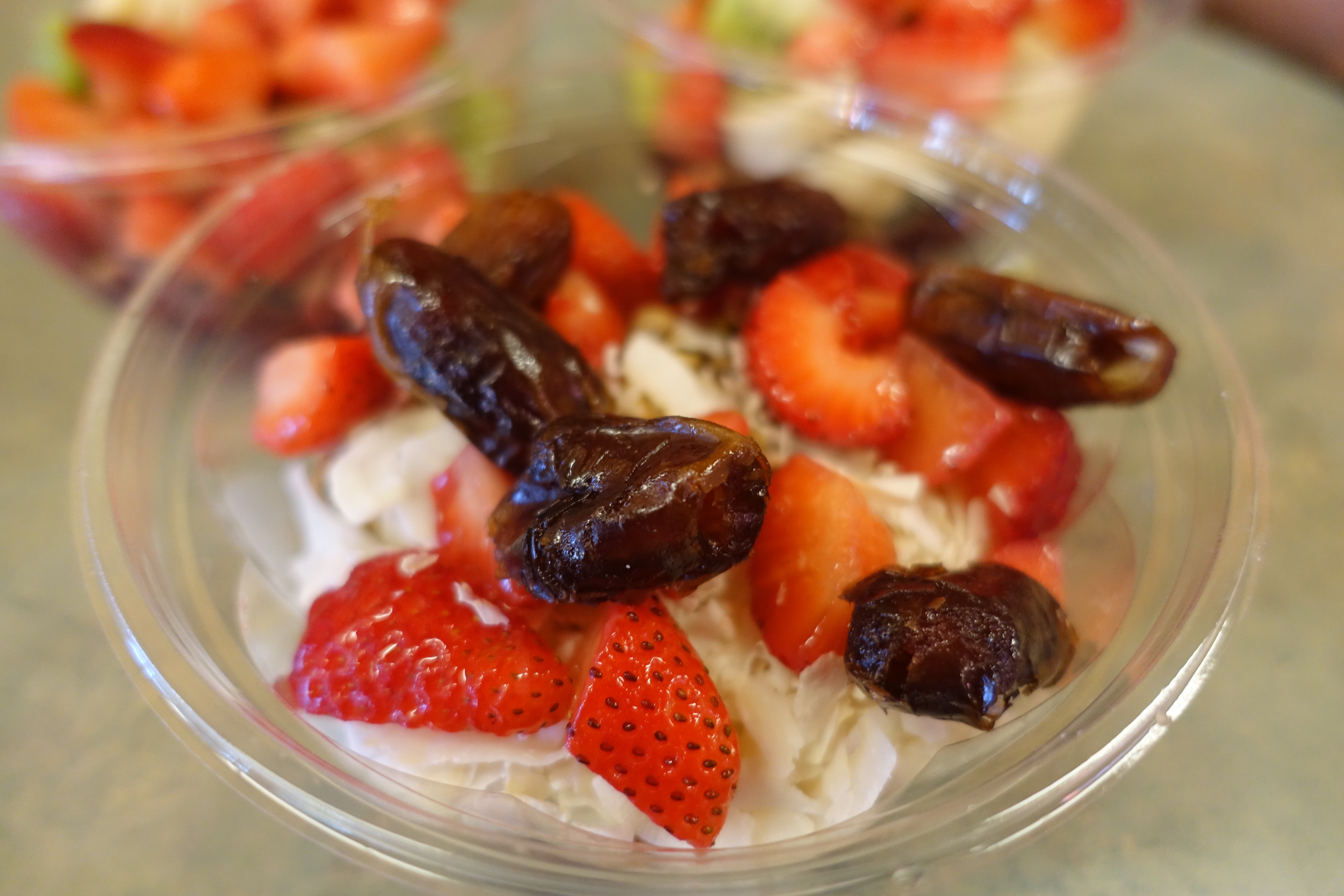 Bella got the acai w/ pineapple and topped w/ coconut, strawberries, and dates.