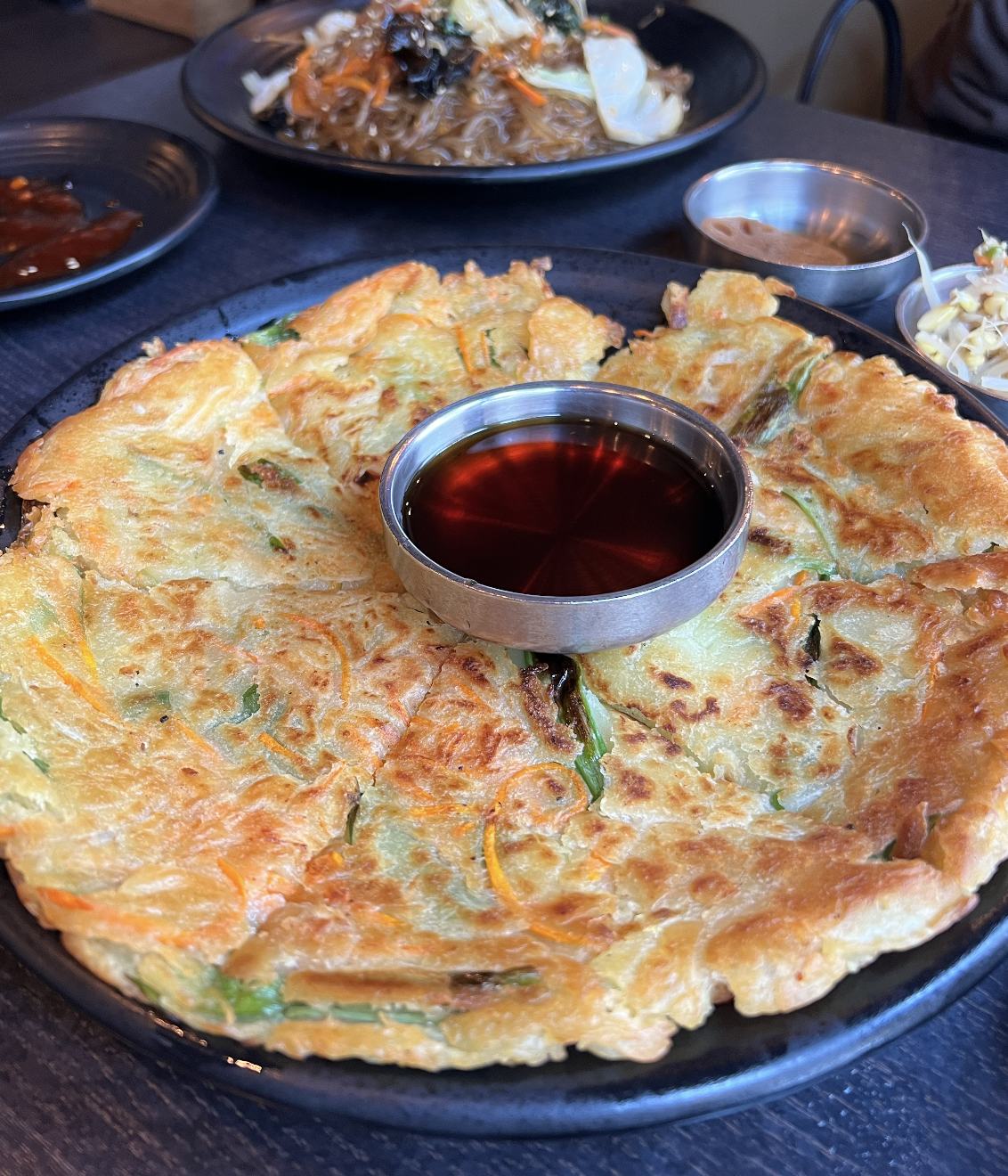 Next, we got the vegan scallion pancake. The sauce it came with was so tangy and almost ponzu-y and delicious. That was my favorite part of this particular dish. The scallion pancake itself? I would probably skip tbh. Maybe just get the sauce on the side to dip other things into lol.