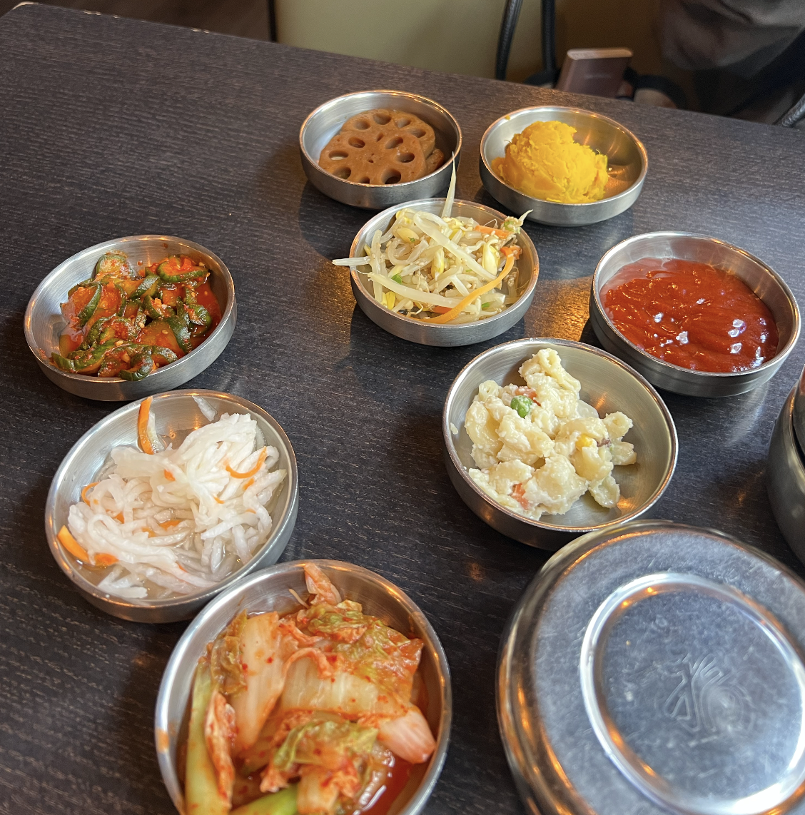 Then to start we got the vegan banchan, which are essentially traditional Korean side dishes like spicy cucumber, kimchi, macaroni salad, marinated lotus root, bean sprout salad, pickled daikon, etc. Half were gluten-free and all were vegan! They were EPIC! We literally almost licked the bowls clean.