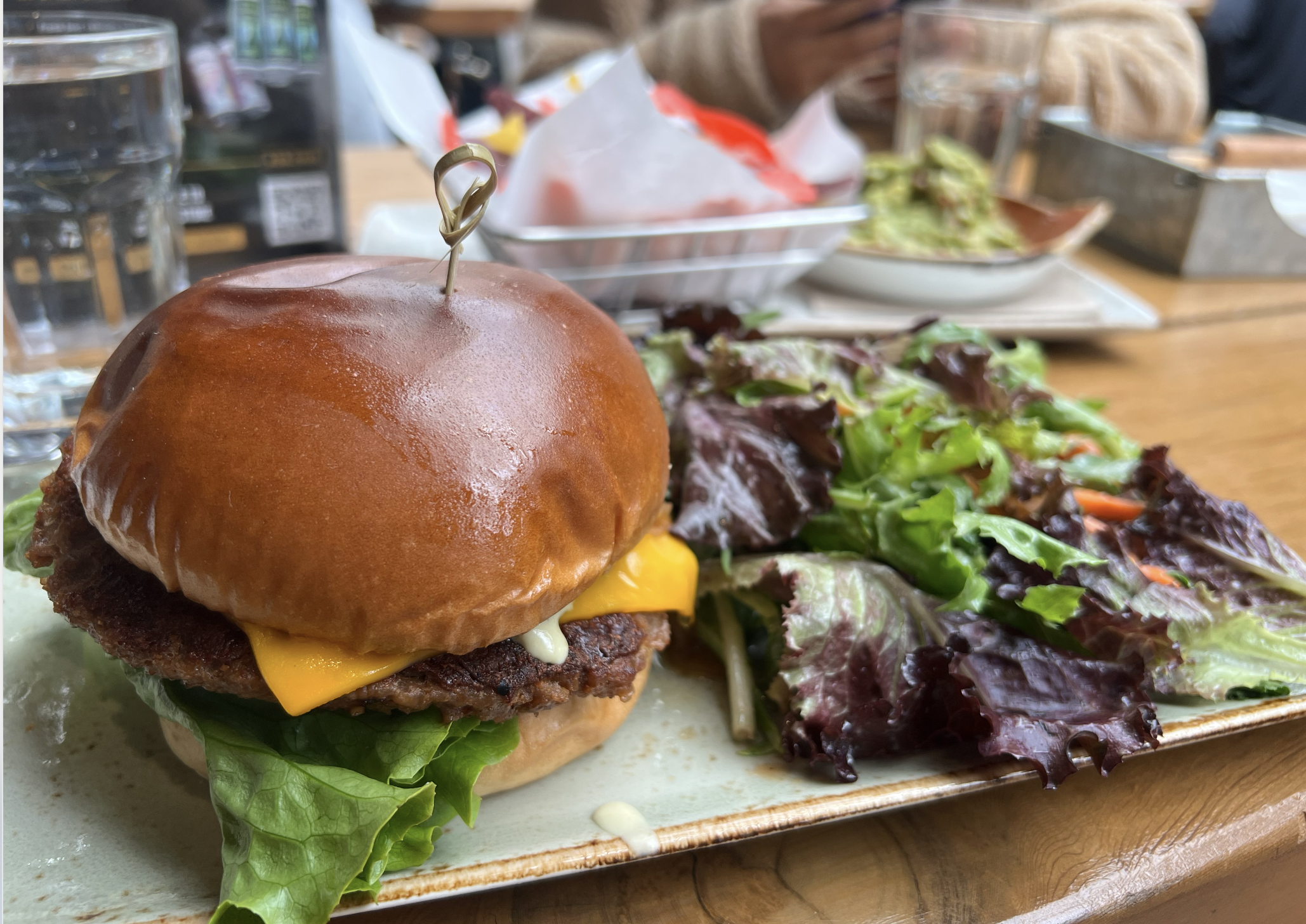 To start, we got the tortilla chips and guacamole. The guac was FIRE. It had corn in it and was super, super tasty. Same with the chips. The vegan burger, though?? OUT OF THIS WORLD. A truly fire vegan burger for a restaurant that doesn’t specialize in vegan food. The bun was gourmet, the patty (Beyond Meat maybe?) was meaty and cooked to perfection, the cheese was delicious, the caramelized onions were heavenly, and the vegan aioli was perfection. If you’re a burger fan, you def gotta stop and maybe enjoy a beer if you’re into that too>> Is beer vegan? IDK, I don’t drink it lol.