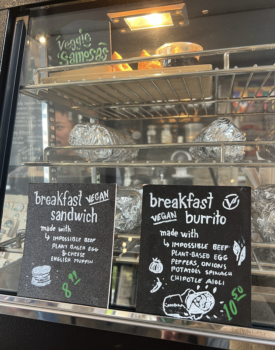 East Village Coffee was this SUPER cute, vibey, and vegan-friendly coffee shop in Monterey. They had a ton of vegan options, but the ones I took note of were the vegan burritos, the vegan breakfast sandwiches, and the veggie samosas.