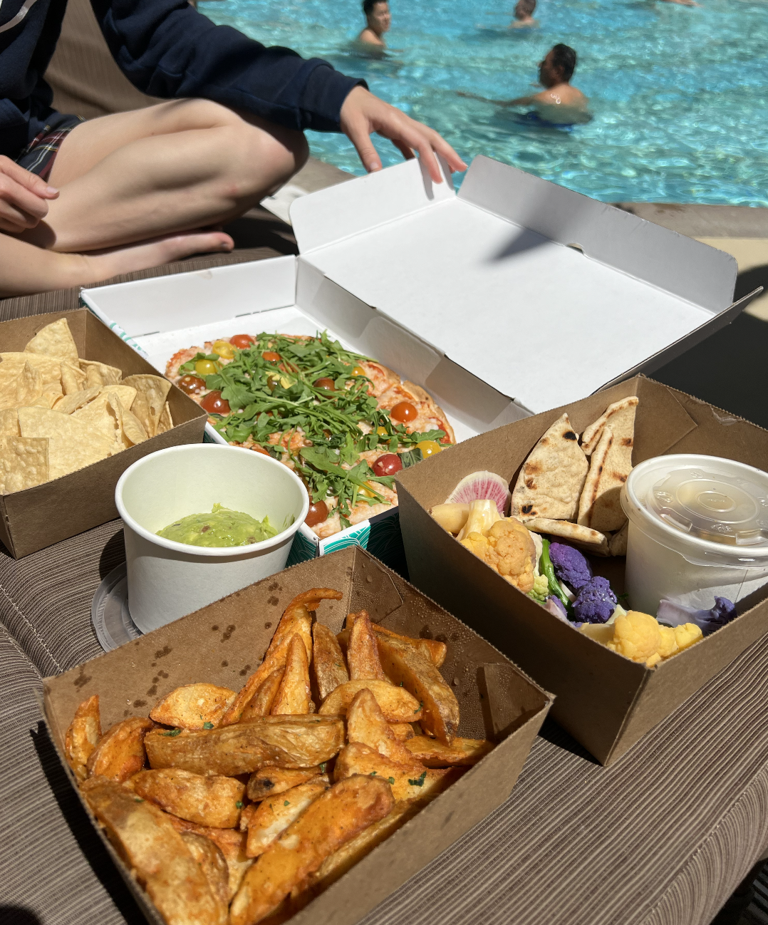 To start, we got this delicious rum punch-esque drink. It dangerously tasted like fruit juice and we loved it. Then for appetizers, we got the chips and guac, a hummus plate, and truffle fries minus the parmesan. All were pretty good! Nothing to rave home about, but perfect for poolside snacks. For the main meal, we got a vegan margarita pizza. Can you believe that!? They had vegan cheese at this place!! It was so, so yummy!