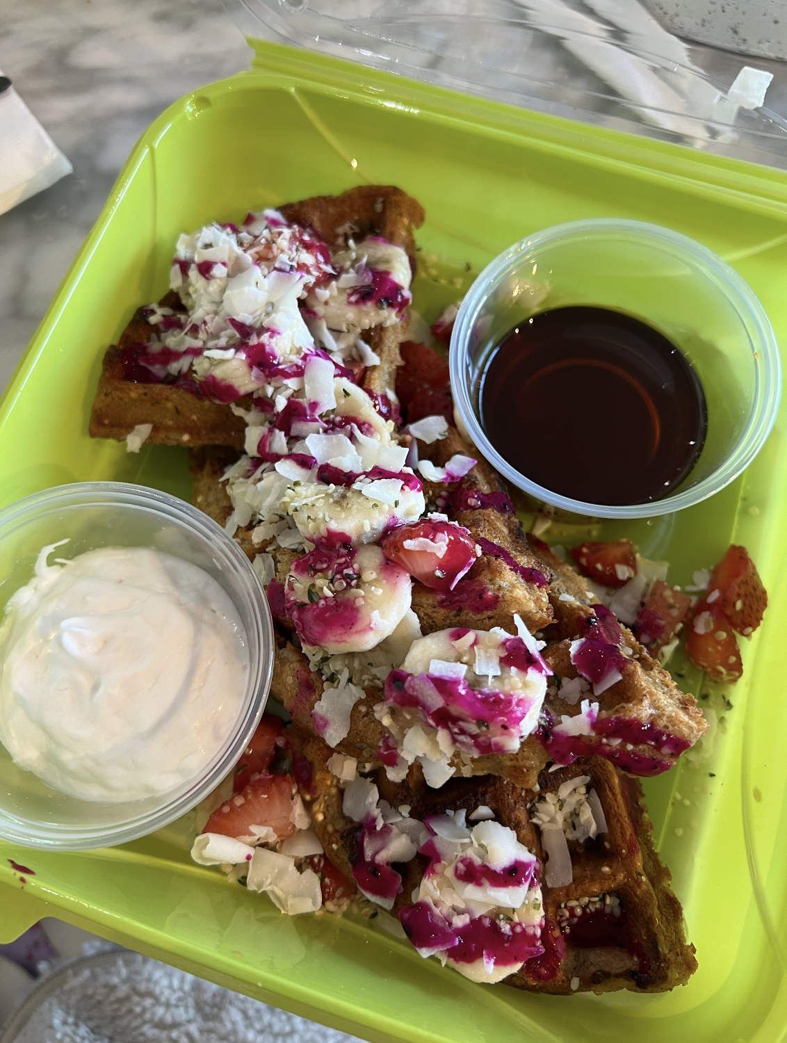 Then we got the vegan version of their protein waffles, which came with vegan whipped cream, maple syrup, strawberries, bananas, and a pitaya drizzle. They were BOMB! We love waffles, so it’s pretty hard to disappoint us with them. My only gripe was that I wish they came with more strawberries. The tartness really helped cut the sweetness, so more of them would have been perfect.