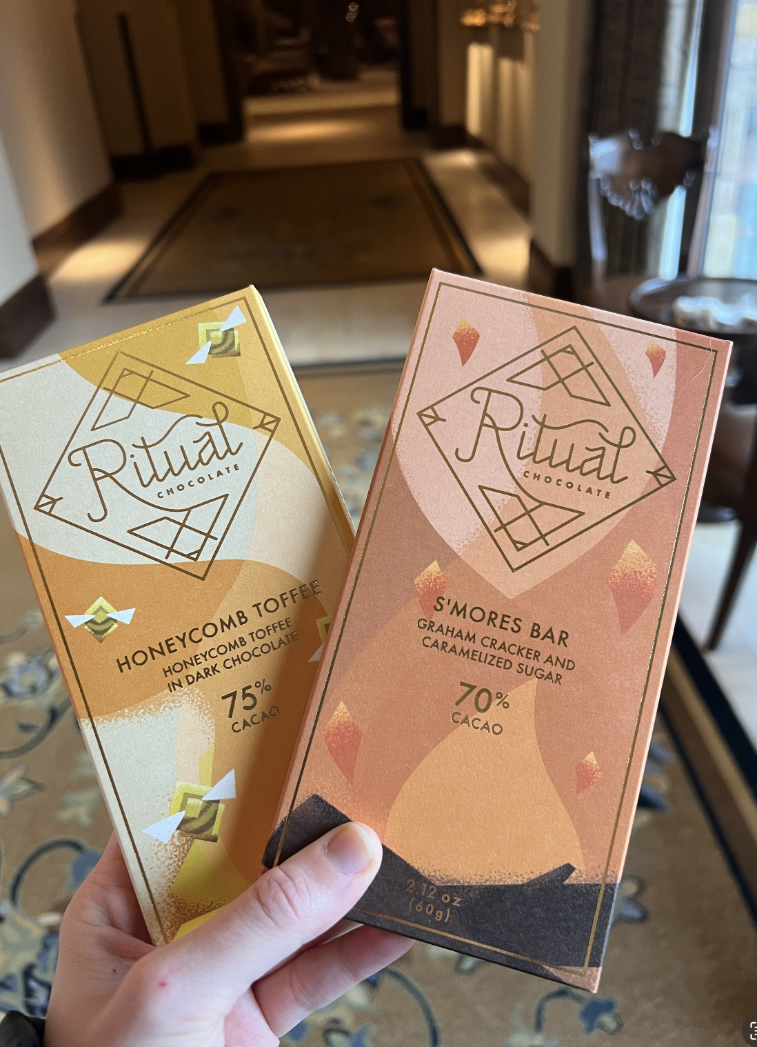Then, at the hotel cafe, they had non-dairy milks, so we got matcha lattes and warm tea. They also served a variety of vegan chocolate bars, including a honeycomb and even a s’mores one, so of course, I had to get both!!