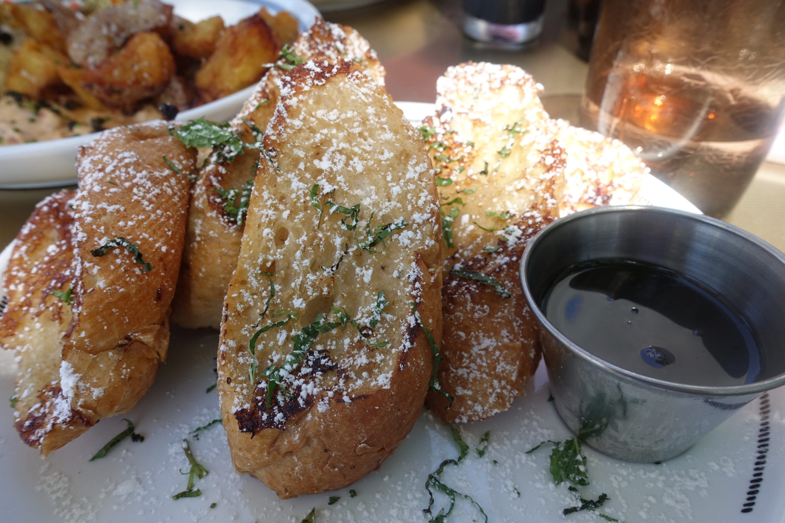 We also got the Bhan Mi French Toast sticks, dipped in banana custard, and sprinkled with powdered sugar and mint. Before you get freaked out like we did, the “Bhan Mi” element of that is just referring to the type of bread used in Bhan Mi sandwiches, not all the fillings lmao. Regardless, it was also UNREAL. I can’t describe the flavor, but it was like sweet baguette french toast. So good.