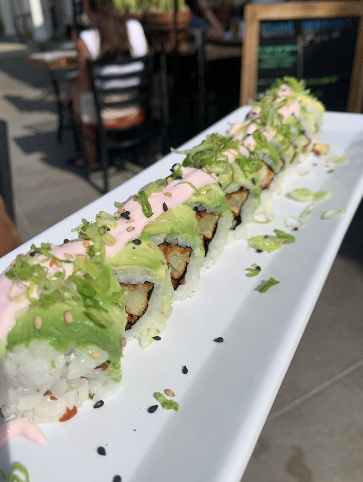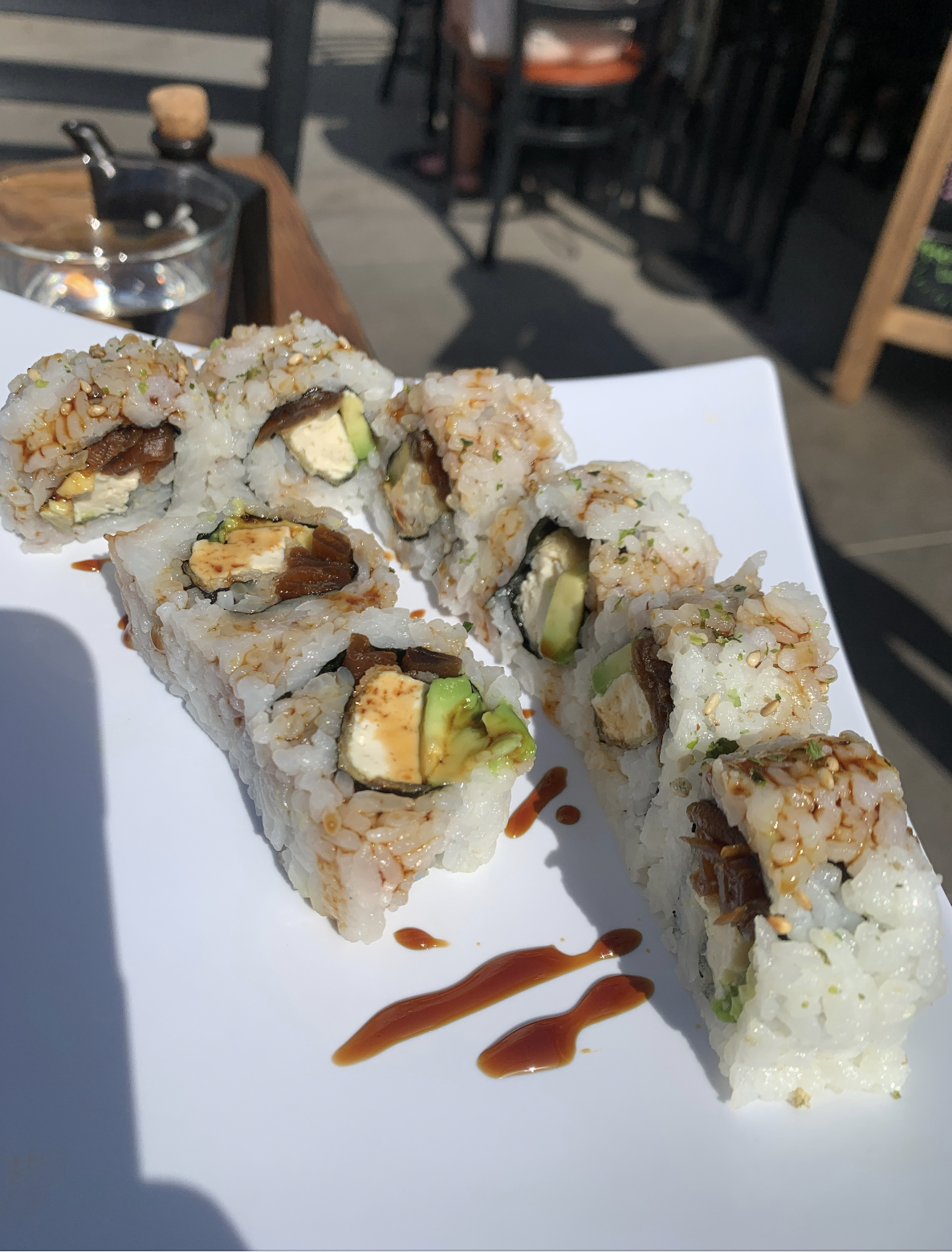 We got two rolls: the “Bea-U-Tofu” (pan-fried tofu, avocado, kanpyo, sprinkled with furikake seasoning) and the “Sweetie Pie” (crispy sweet potato topped with avocado, thin lemon slices, garnished with green onion, and garlic creme).