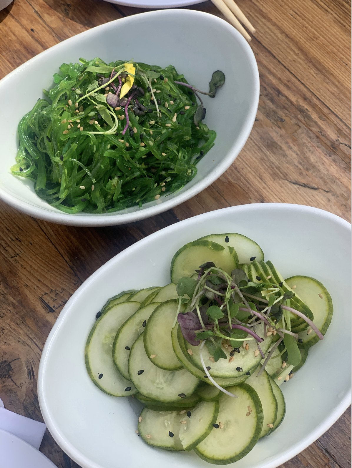 There were so many options on the menu, it was hard to decide, but we ended up going with the seaweed salad and the cucumber salad to start, which were both amazing.