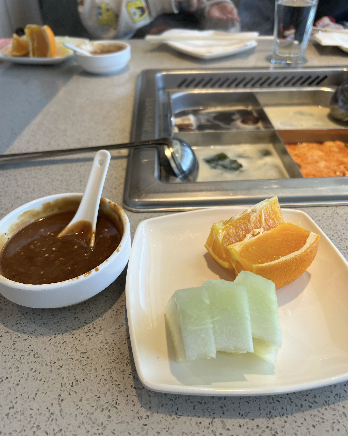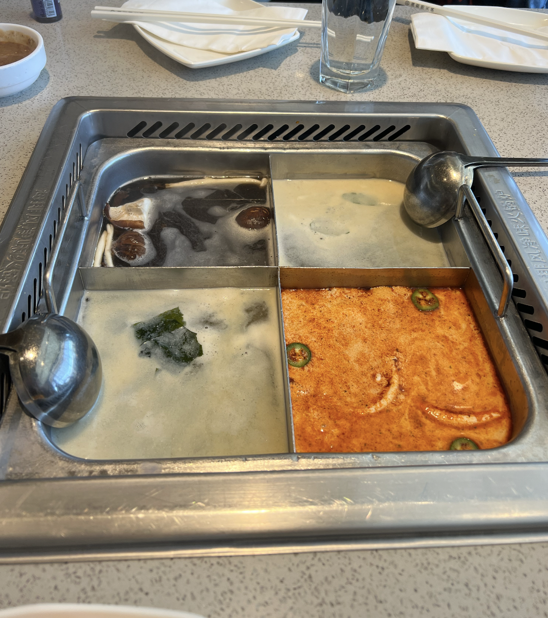 So anyway, first and foremost, the staff at Haidilao is SO incredibly nice and attentive, including the little robot that brings you your dishes. I wanted to adopt it haha. Also, at one point we discovered a piece of shrimp in our broth and our waitress, without question, replaced all four broths and replenished any lost dip-in items (I’ll explain in a bit) that were lost to the “shrimp-contaminated” broth.
