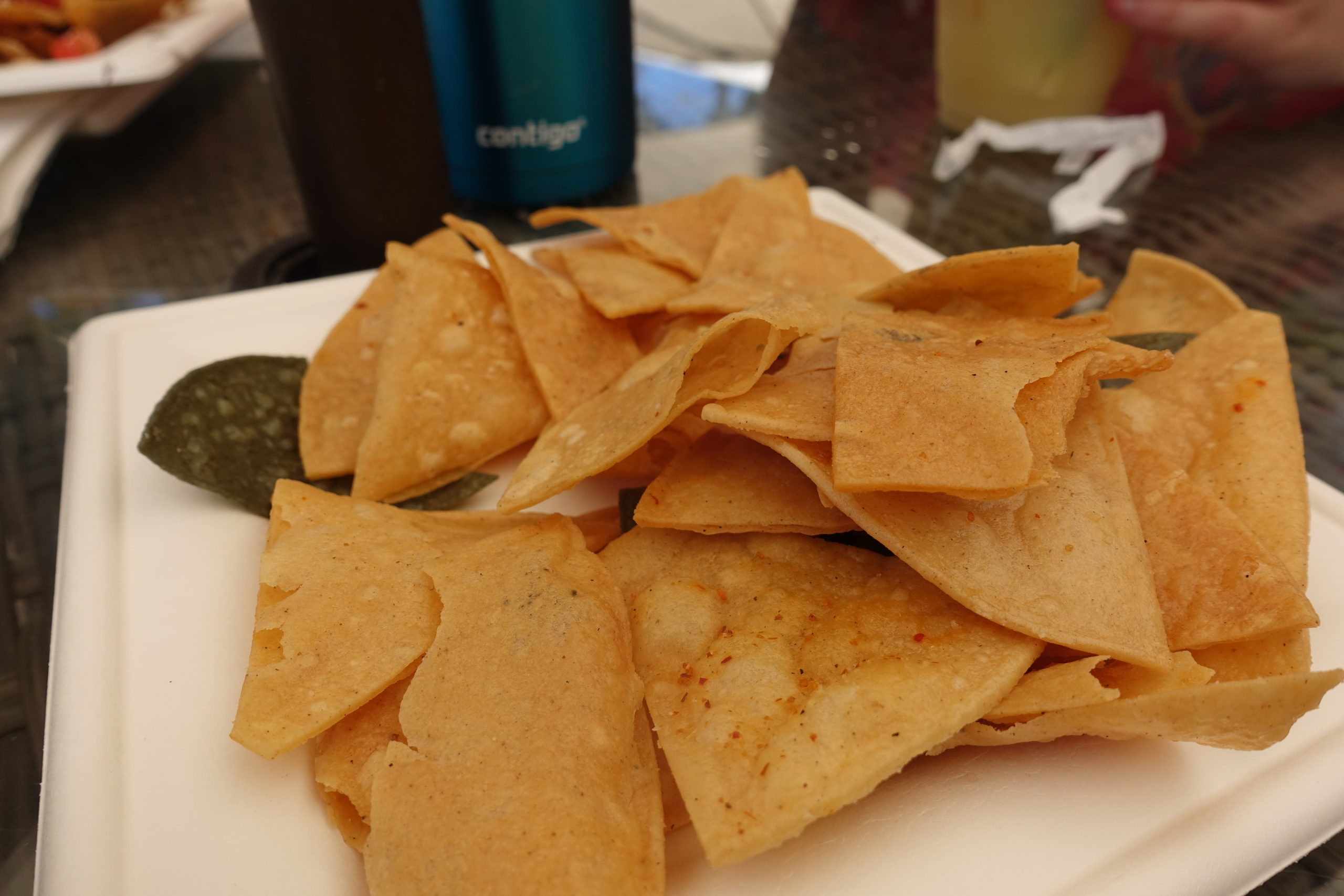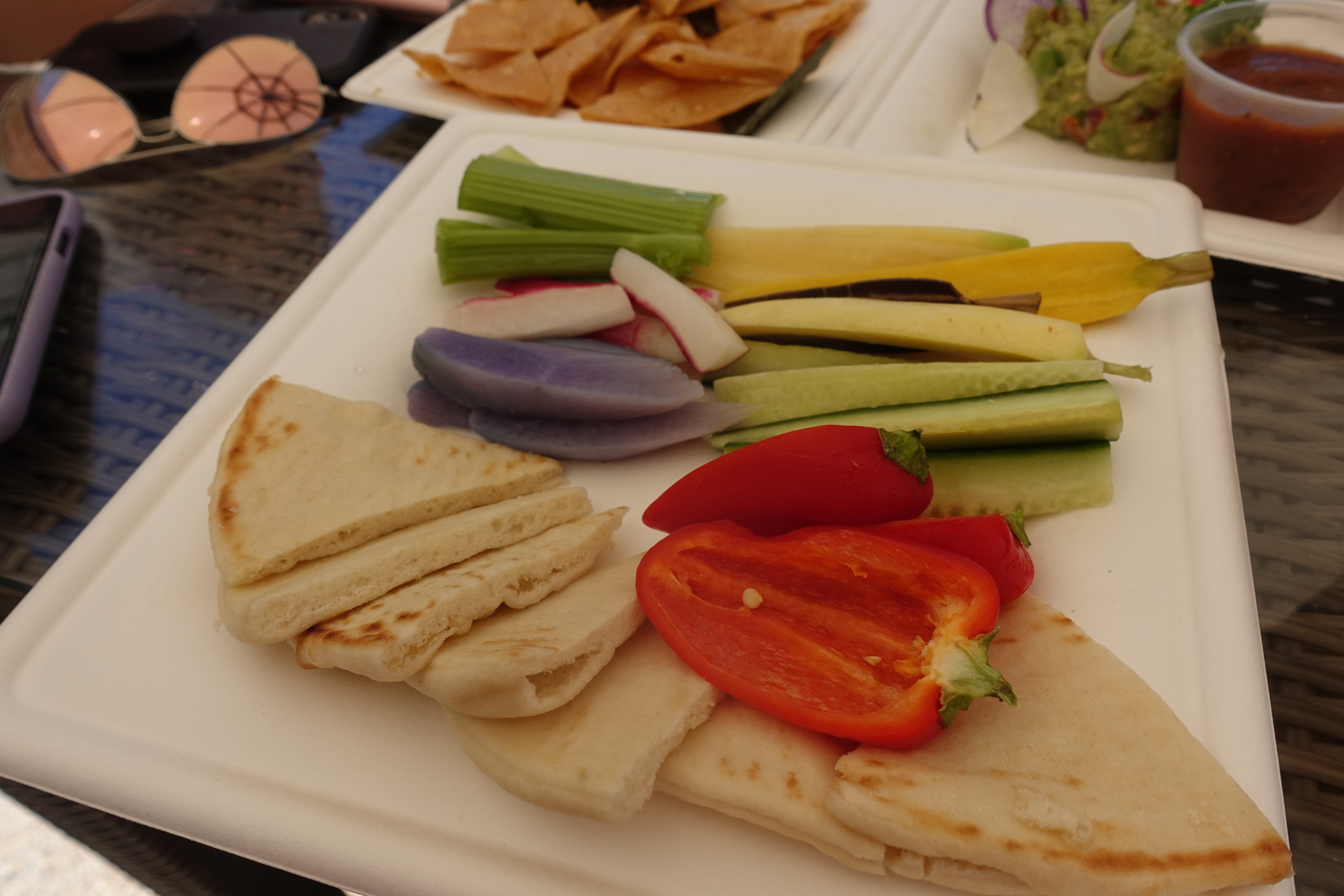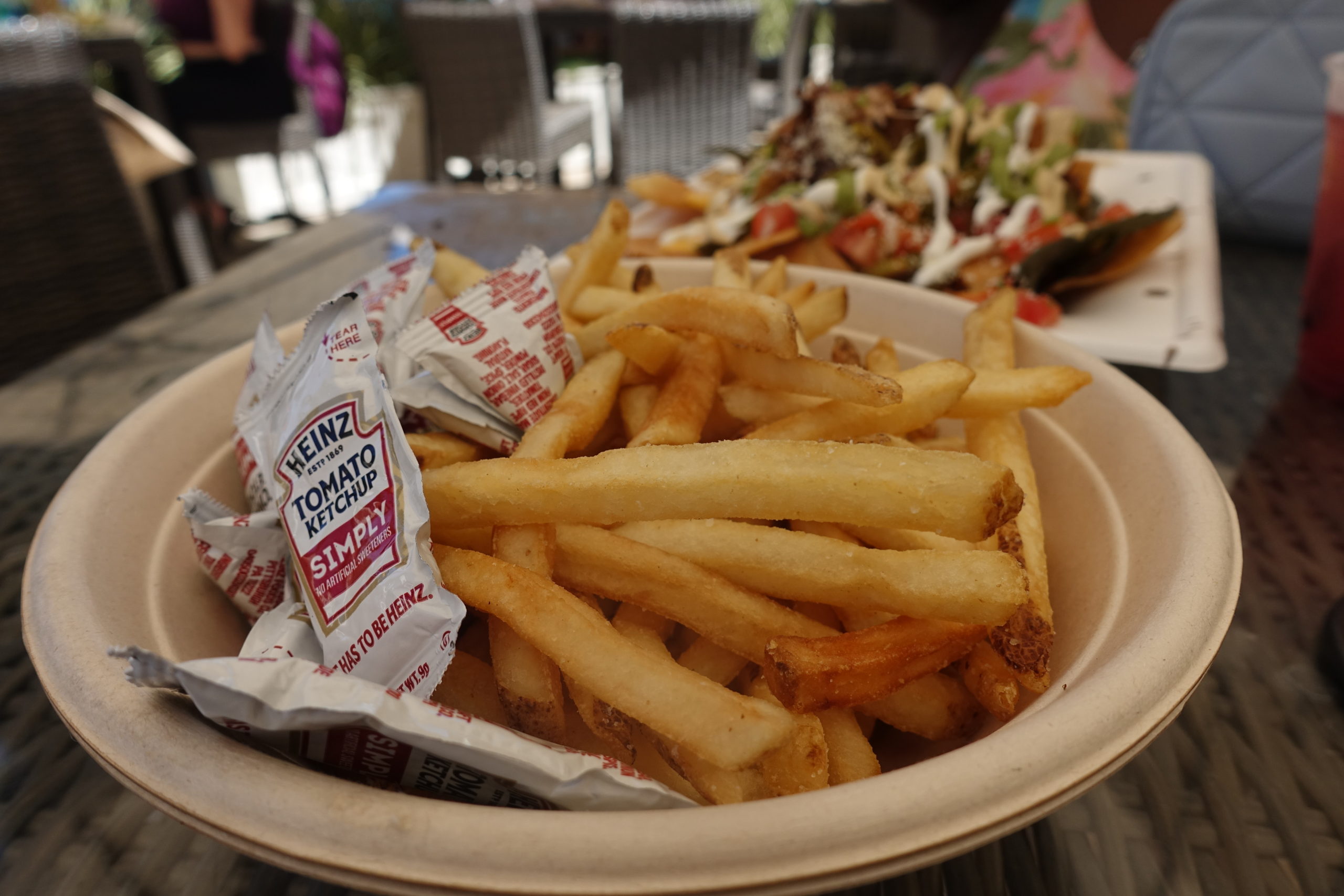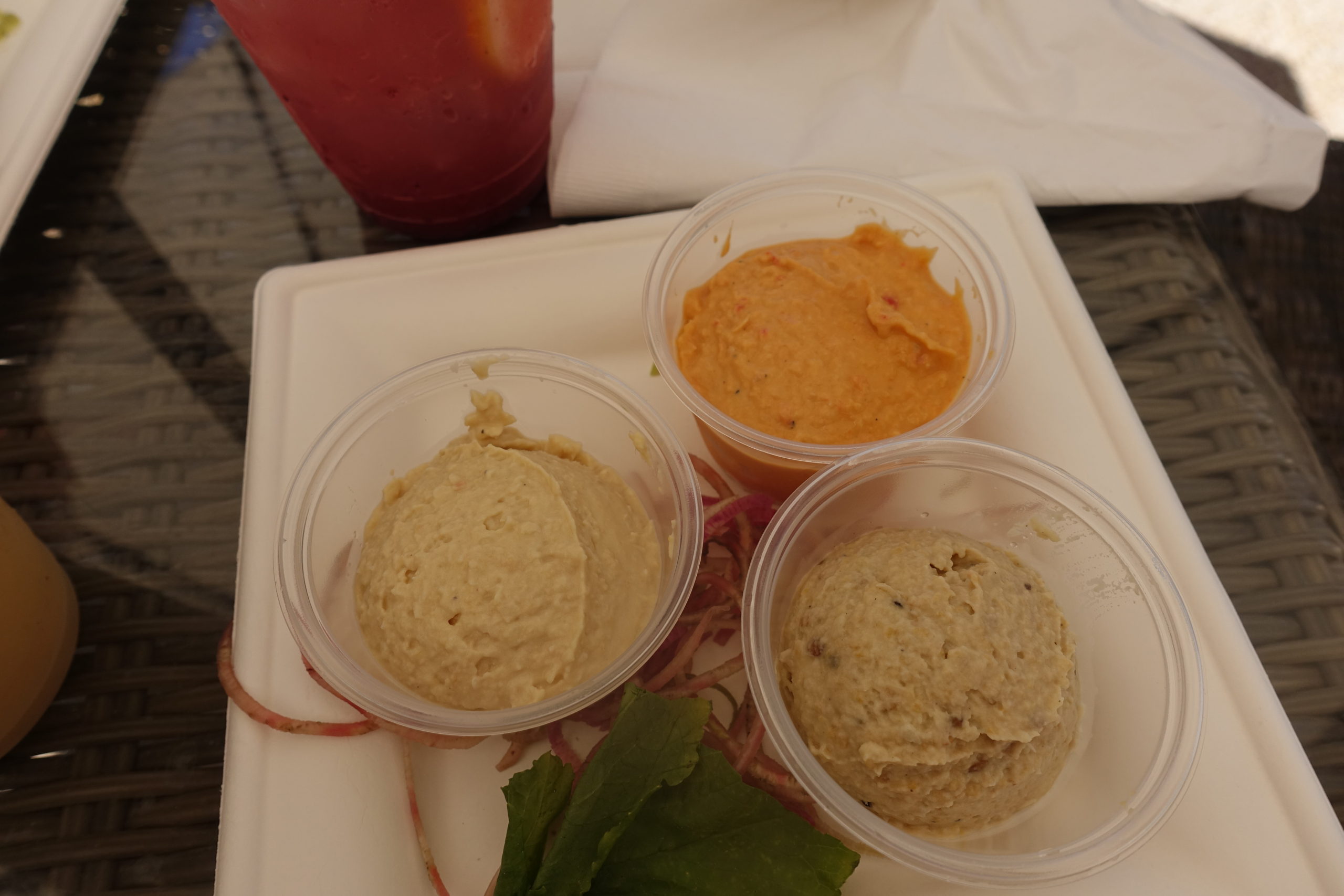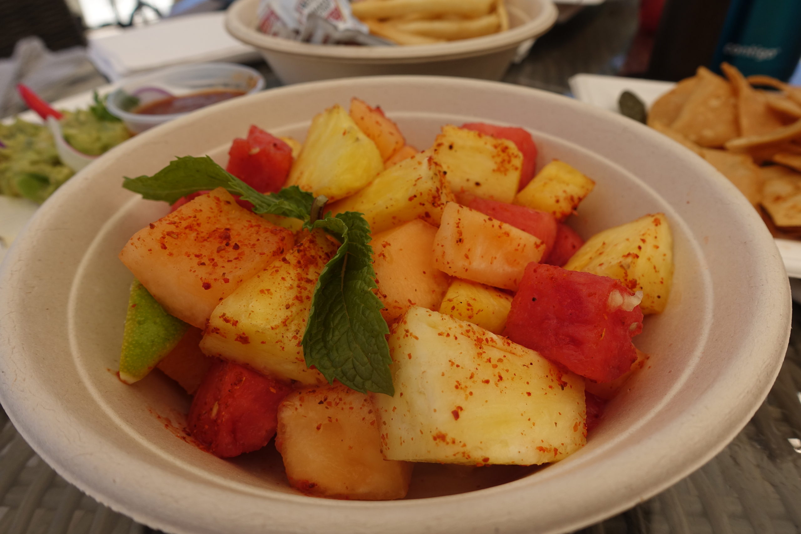 - We also ordered the tajin fruit salad (incredible), fries (eh), the hummus and pita platter (great!), chips with guac and salsa (eh), and Bella ordered a modified poke bowl without the fish and mayo. She said it was amazing.