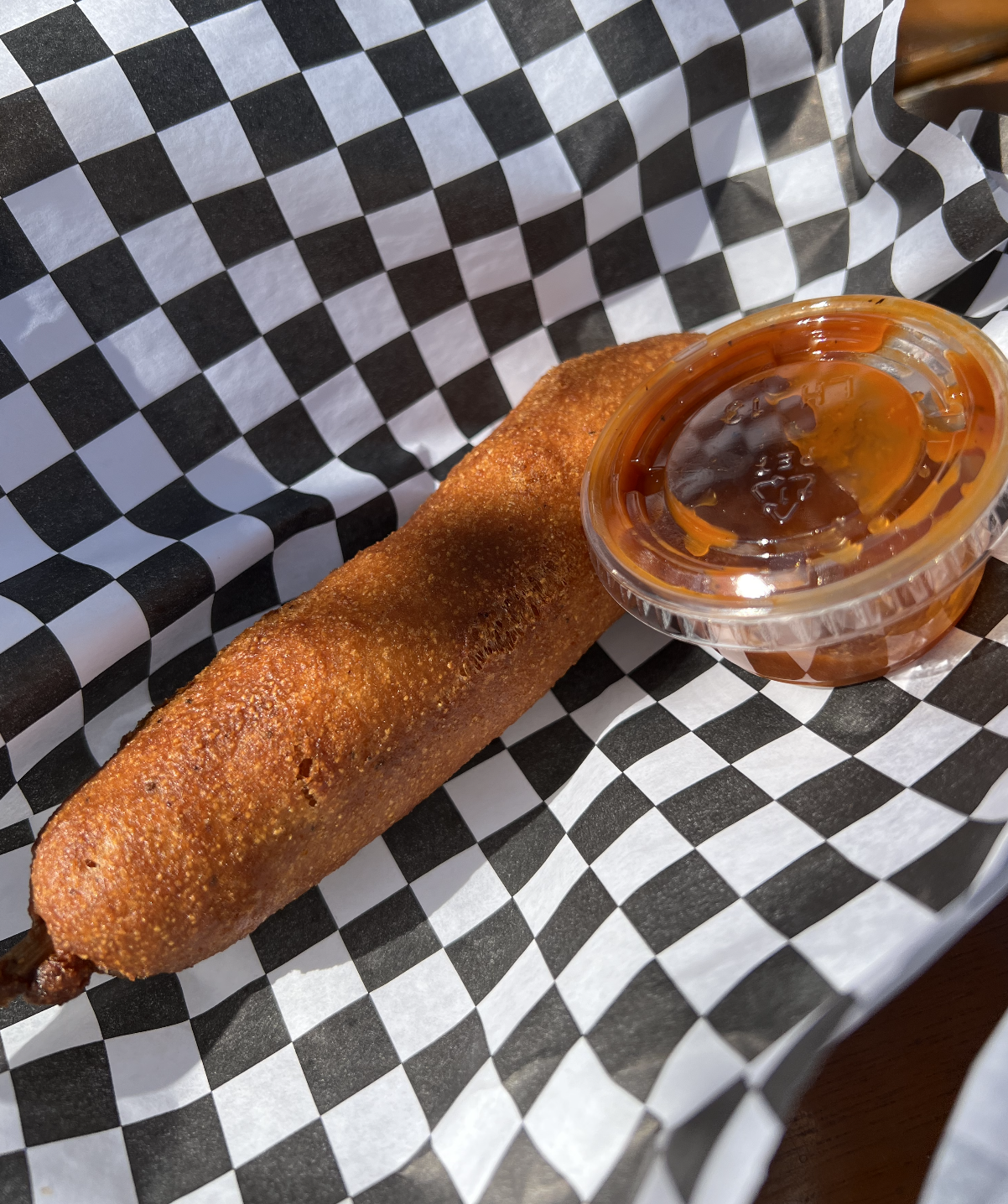 The corndog was okay. The batter didn’t taste too much like a classic corn dog, so I wouldn’t order again, but I want to go back and try one of their chicken sandwiches really bad!! This place had great vibes. Deff check it out!!!